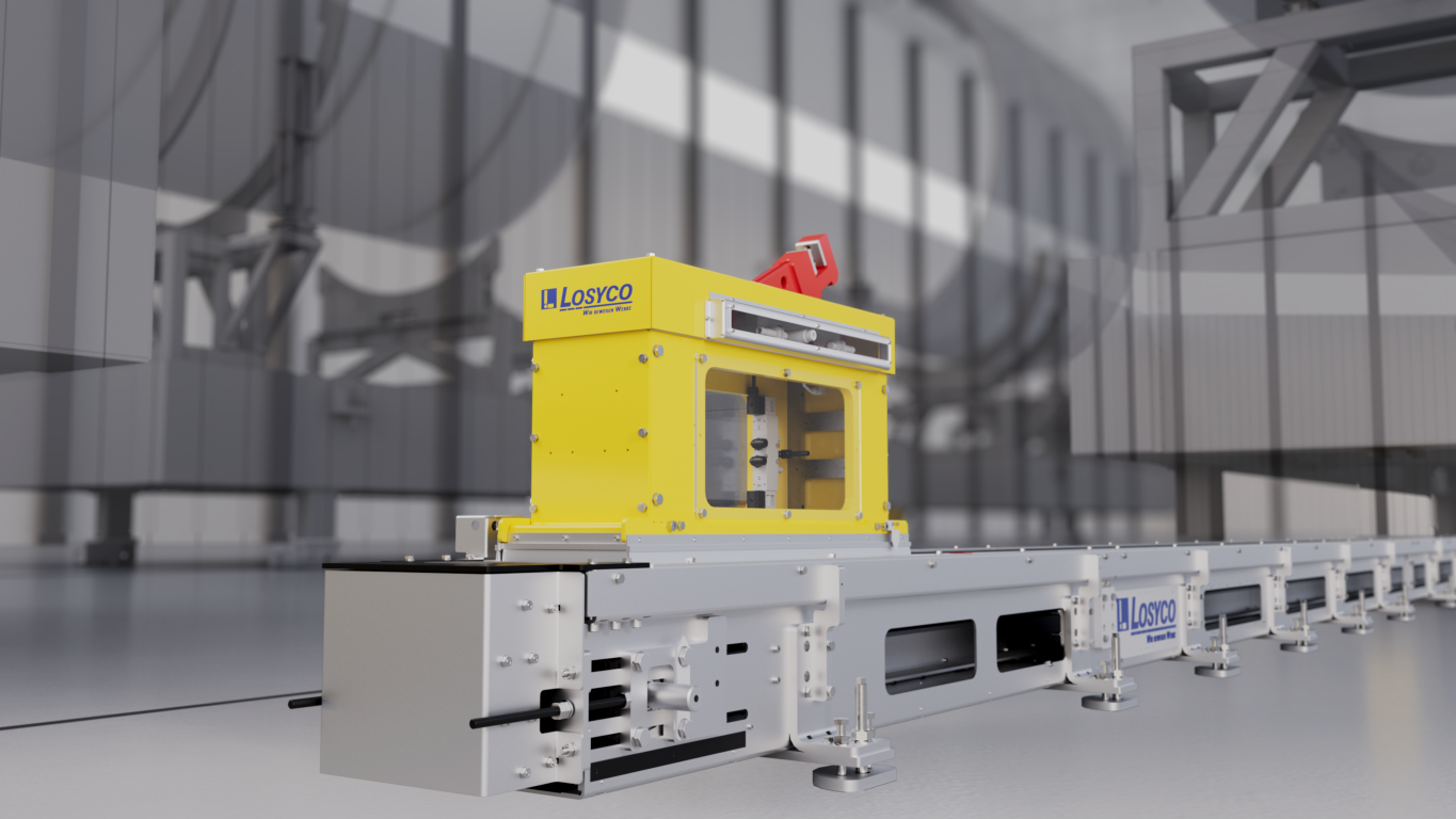 Ein gelbes, flaches Transportmodul auf Schienen in einer Industriehalle, mit metallischen Platten am Boden und dem Namen "LOSYCO" an der Vorderseite.